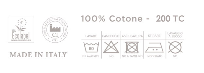 This product has received Ecolabel certification for the absence of elements that are toxic to the skin, and compliance with ethical standards. The high quality of the pure cotton yarn and the 80 threads per cm2 make this percale product soft and resistant to frequent washing.
